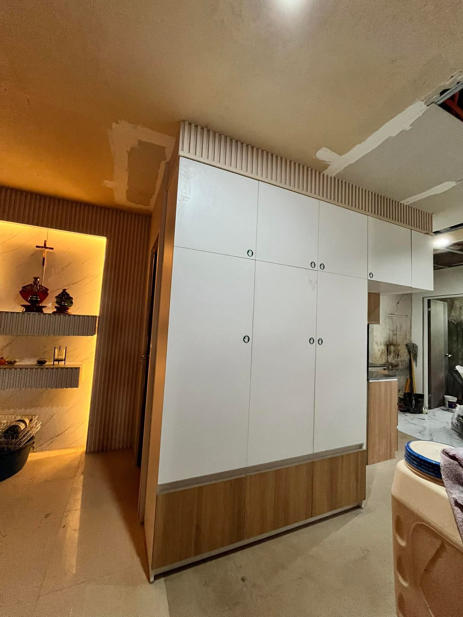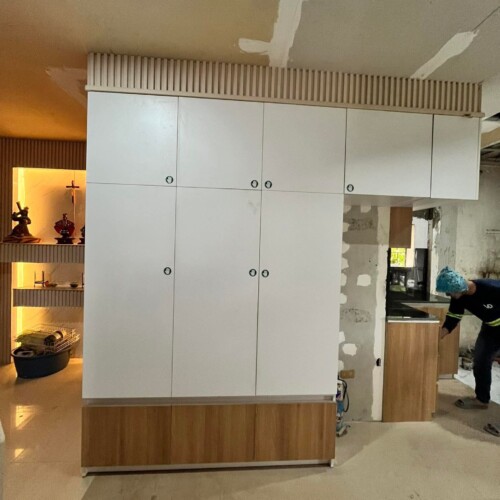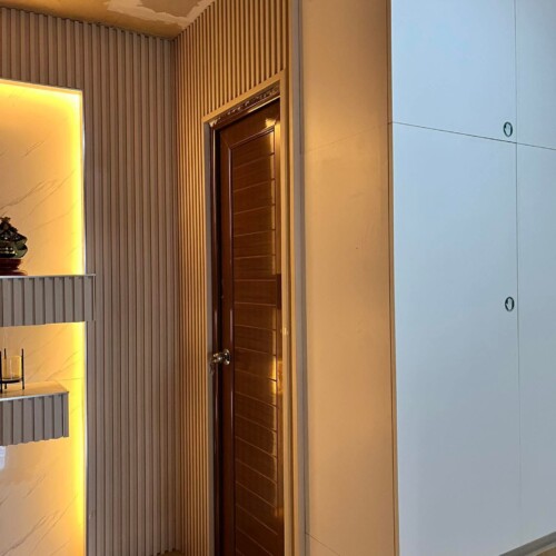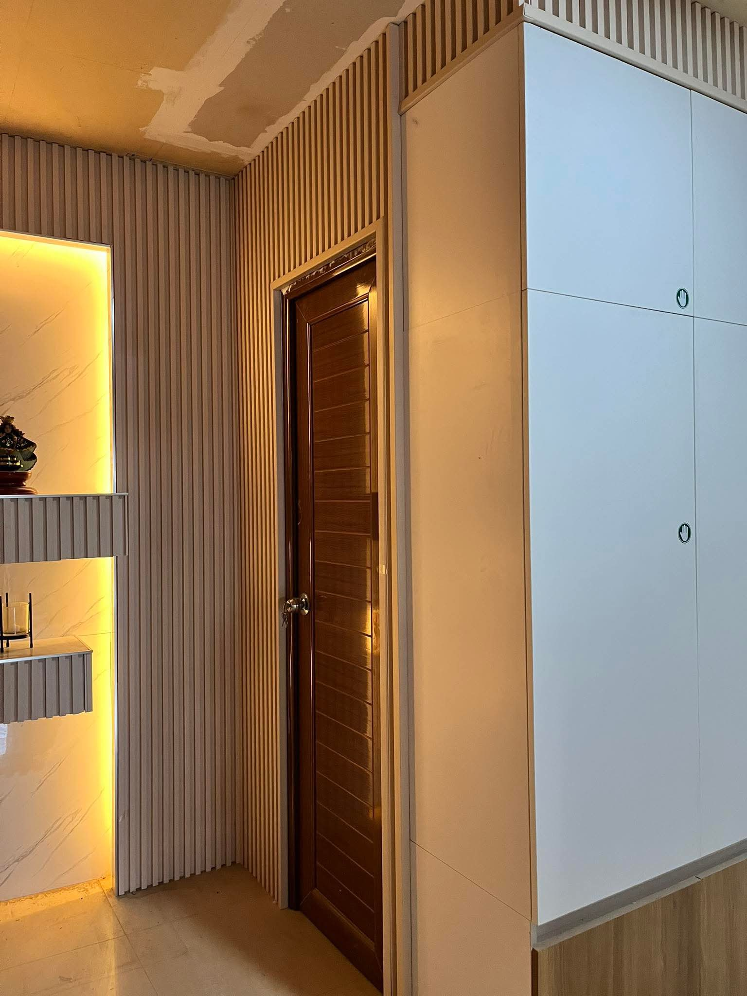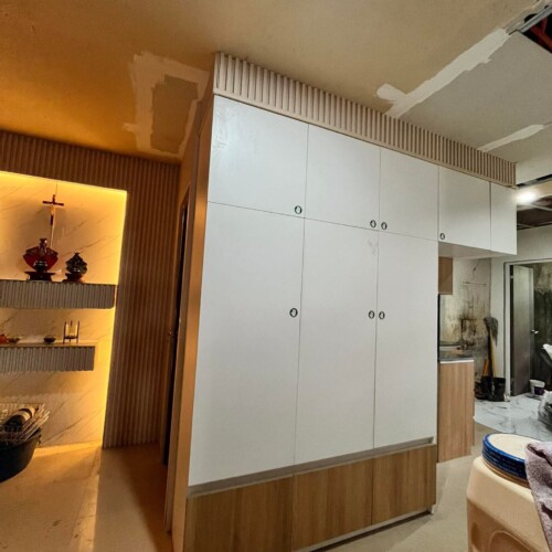 The kitchen is contemporary and sophisticated, balancing the stark modernity of the white slab doors with the natural warmth and texture of the wood slats and shelving.